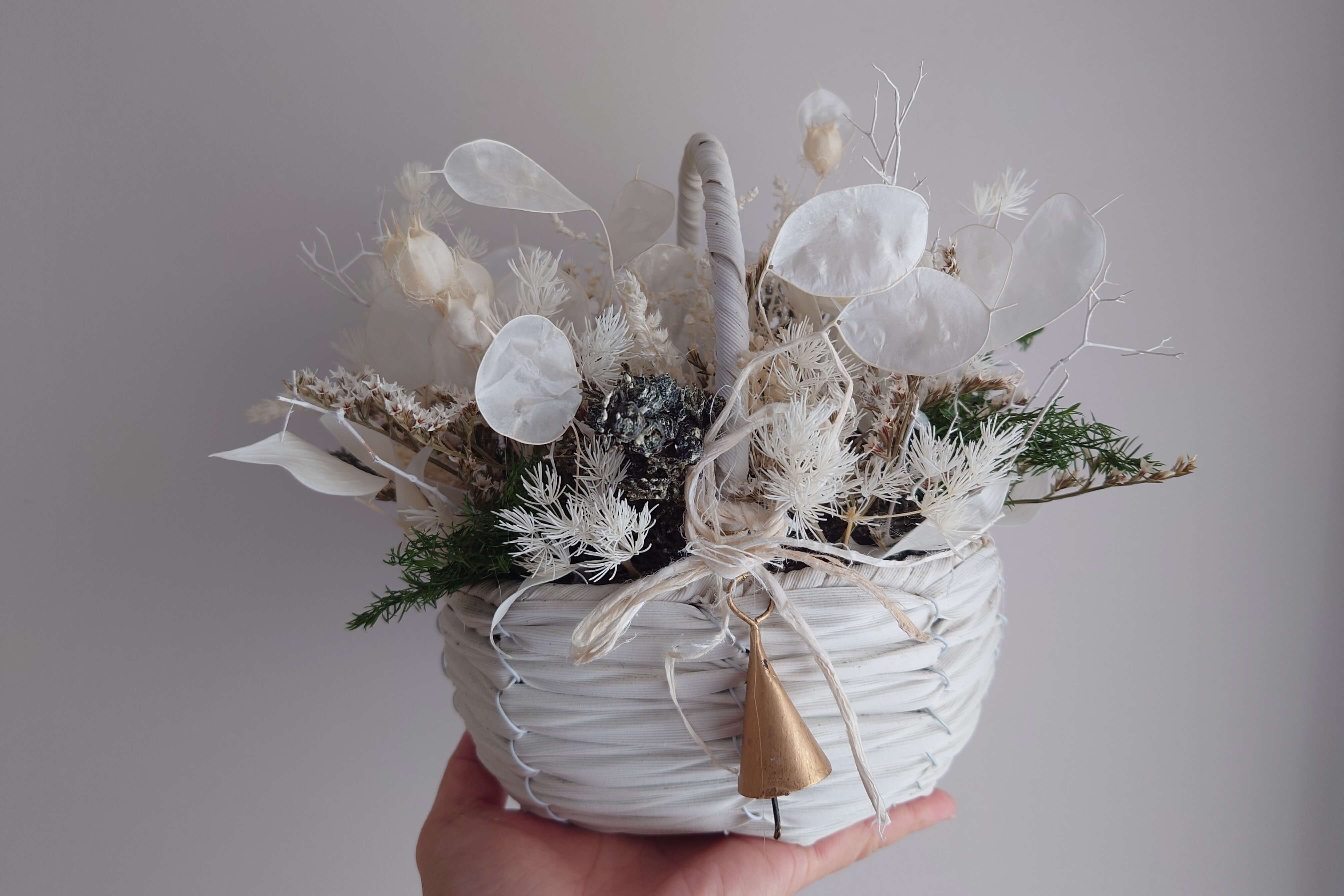 【1点もの】白の森のバスケット やさしい色がふんわりと包む小さな森のバスケット| ナチュラルドライフラワーアレンジ