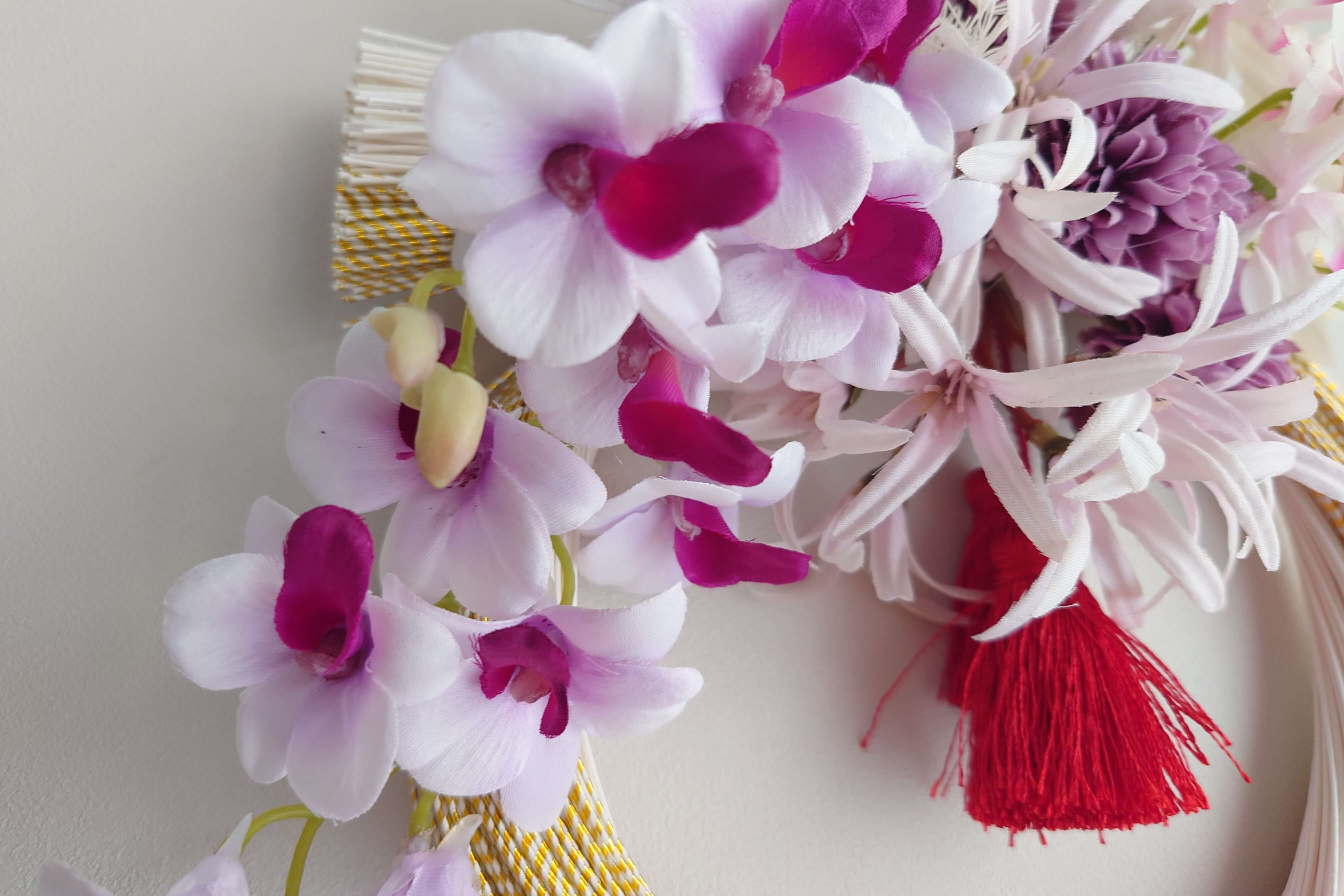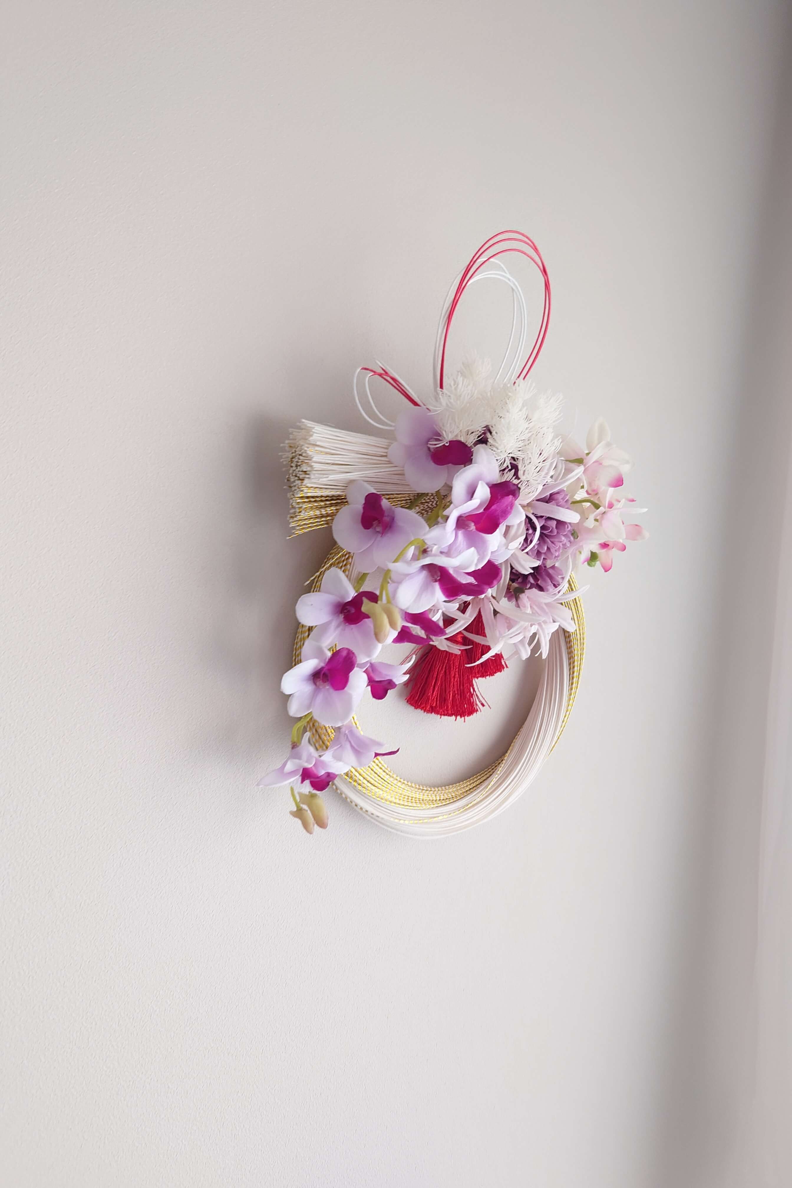 白×金の水引と、ピンクやパープルの花が新年を明るく迎えるアクセントに。