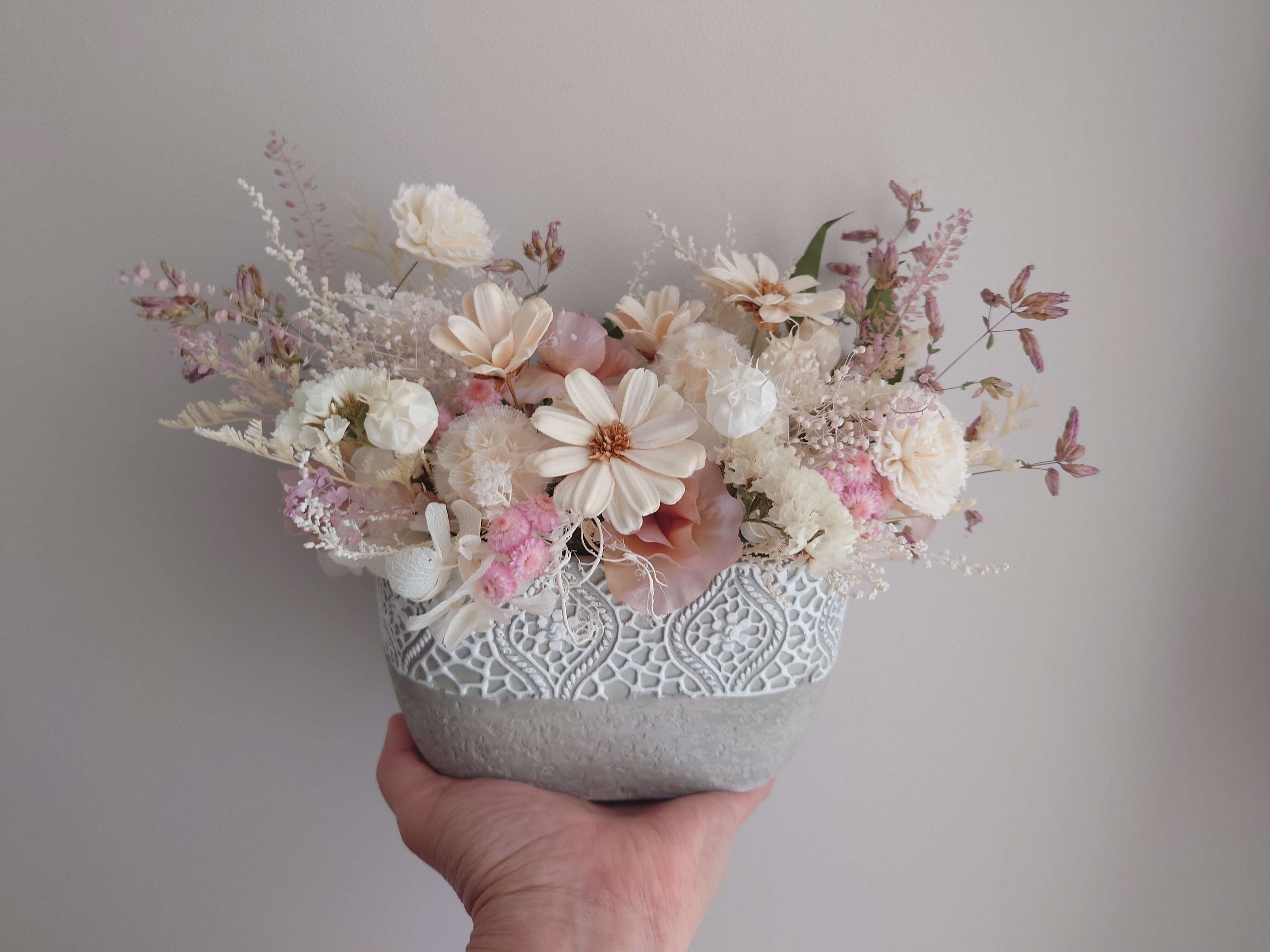 やさしいピンクと白の花々をふんわりと重ねた、淡色のドライフラワーアレンジです。