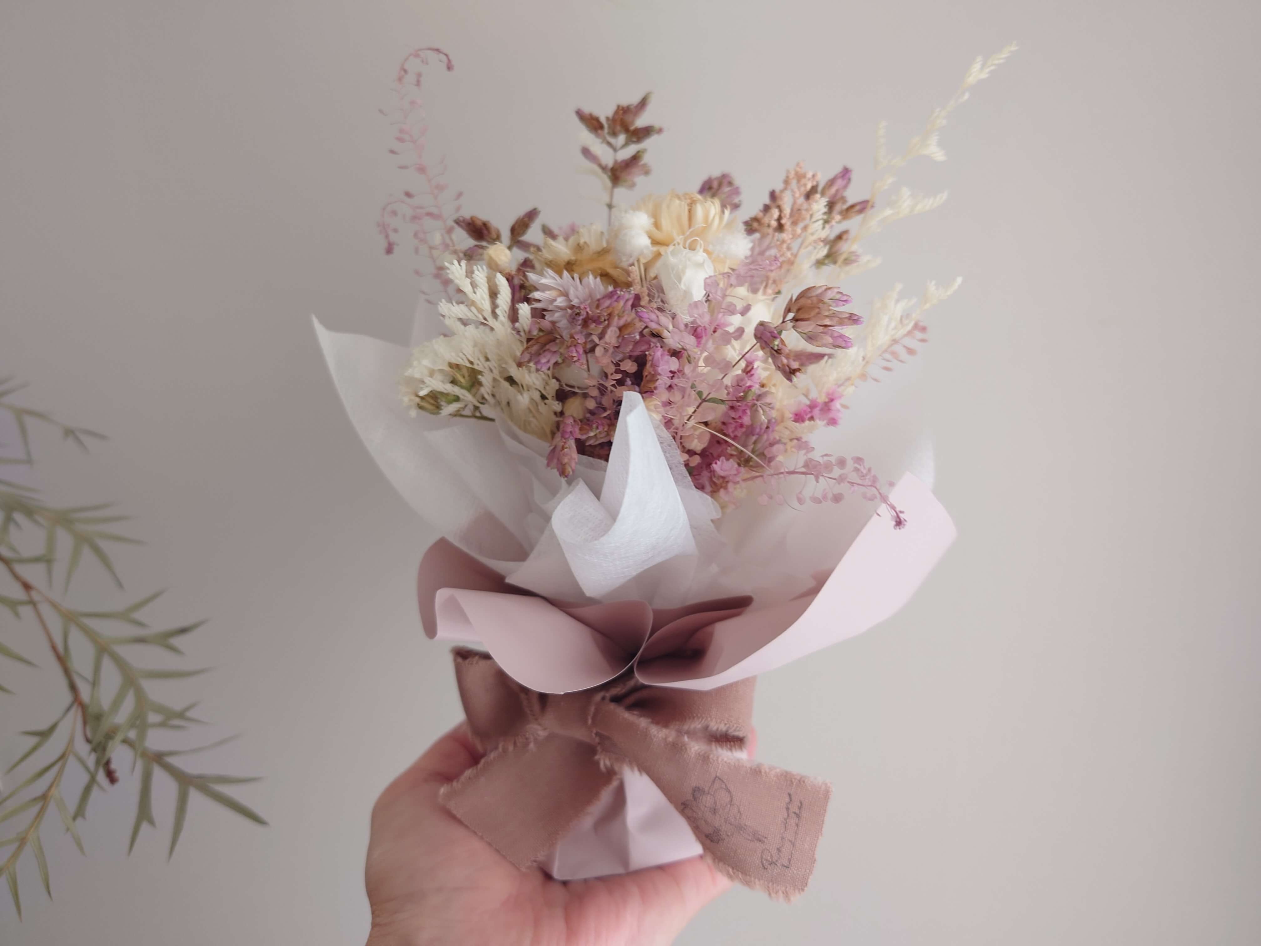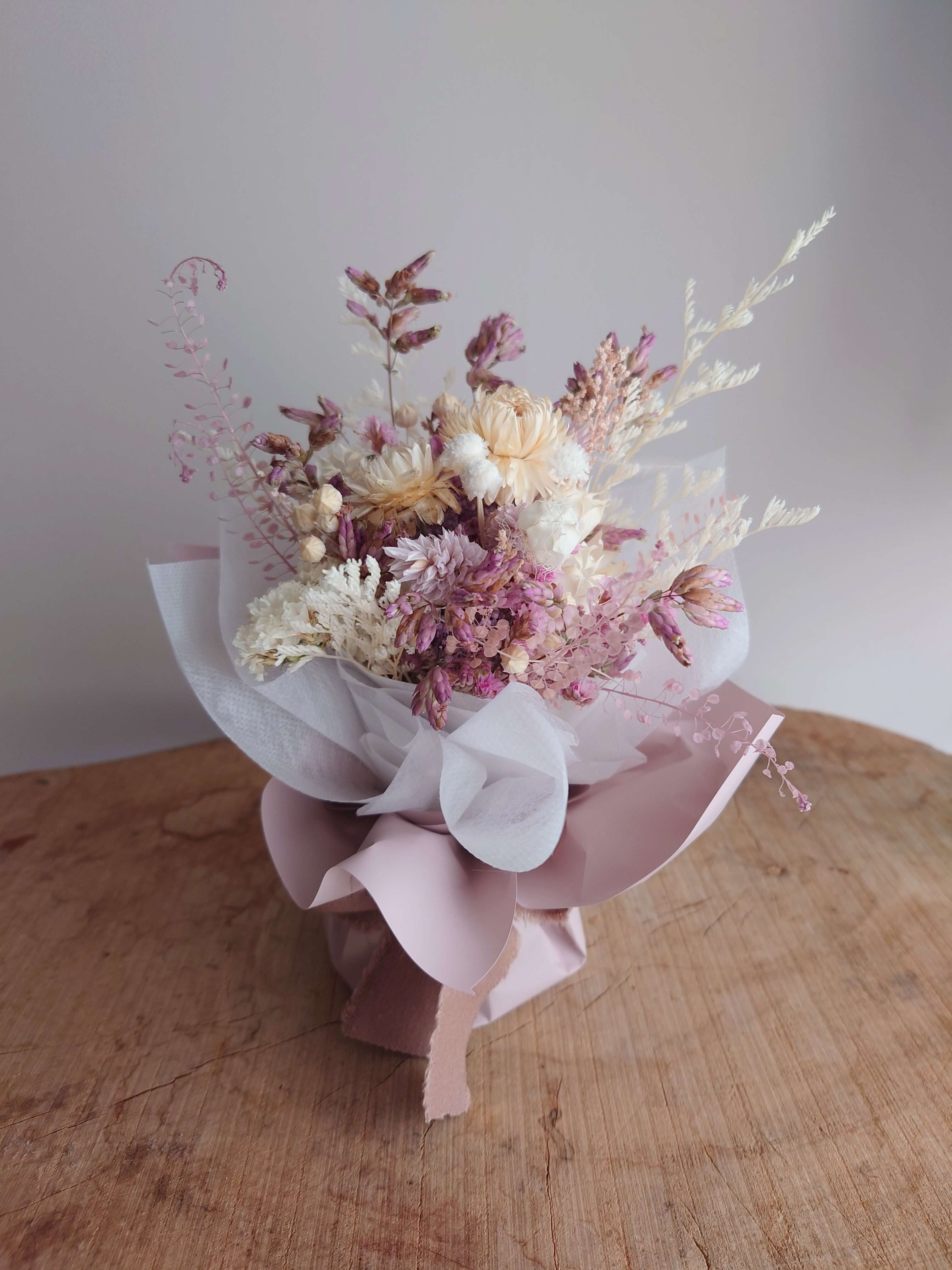 淡色ピンクパープルの置き型ドライフラワーブーケ|そのまま飾れるナチュラルインテリア