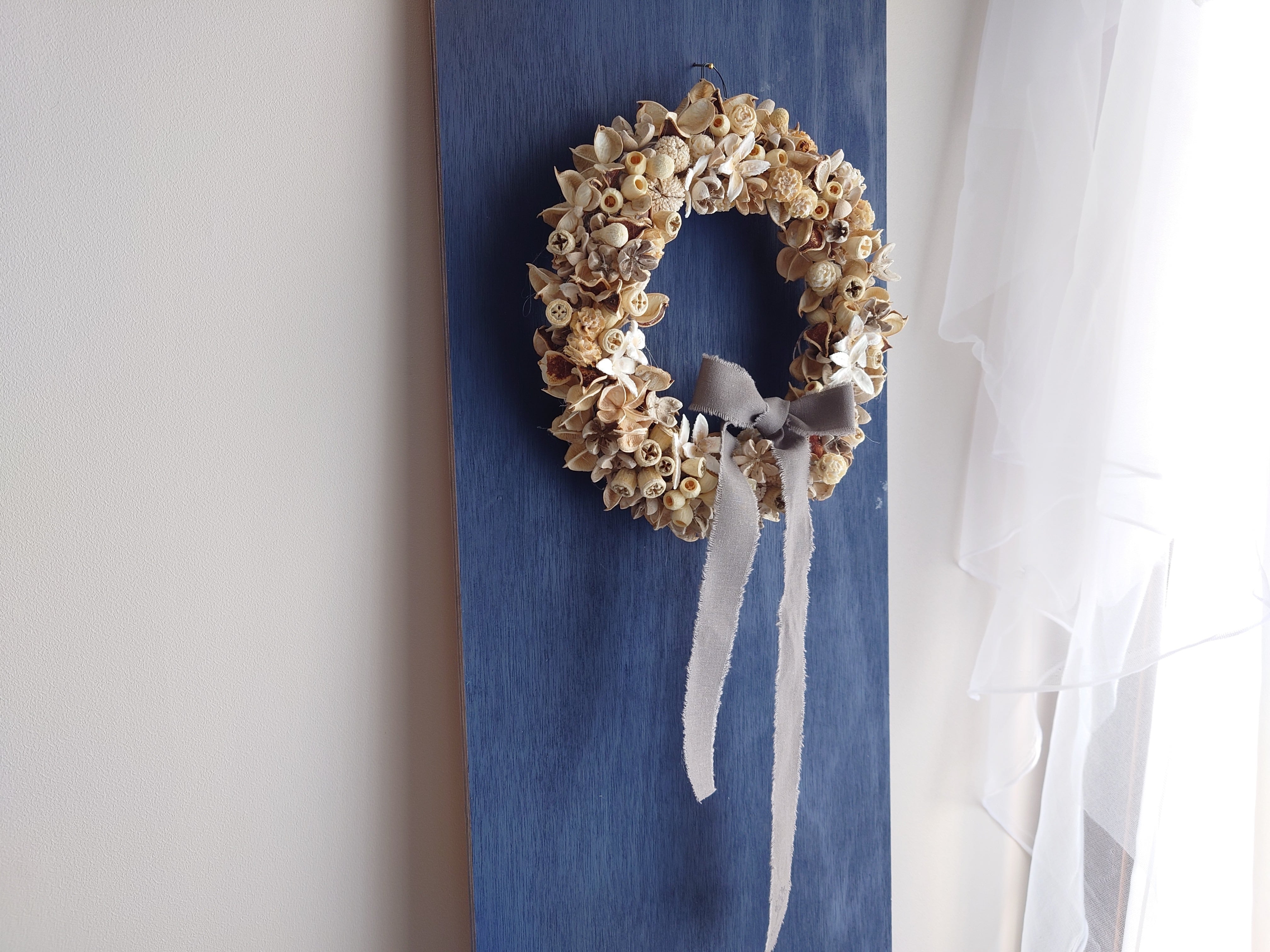木の実のリースは、アースカラーのナチュラルな色合いが特徴です。お部屋に心地よいリラックス感をもたらし、コーディネートも自由自在。特にシンプルなインテリアやカントリースタイルのお部屋にぴったりです。